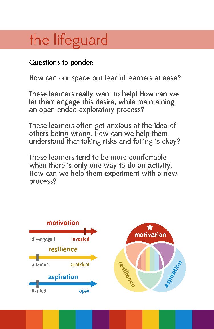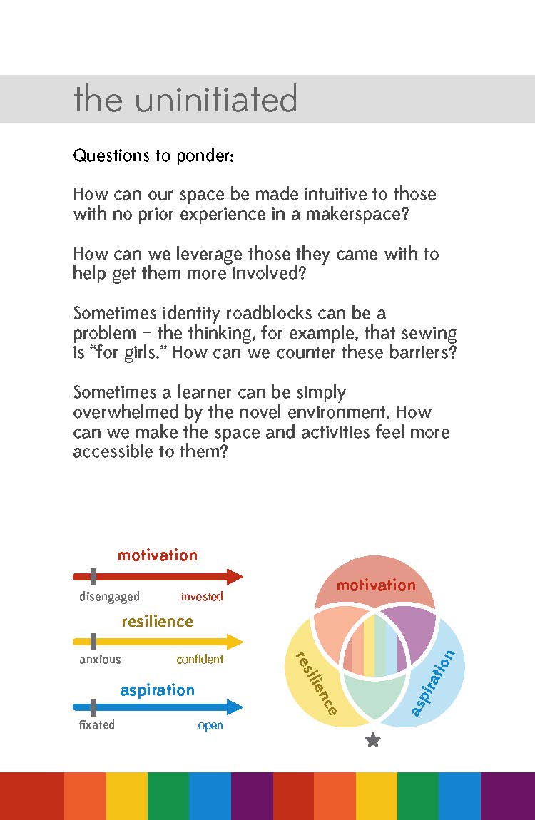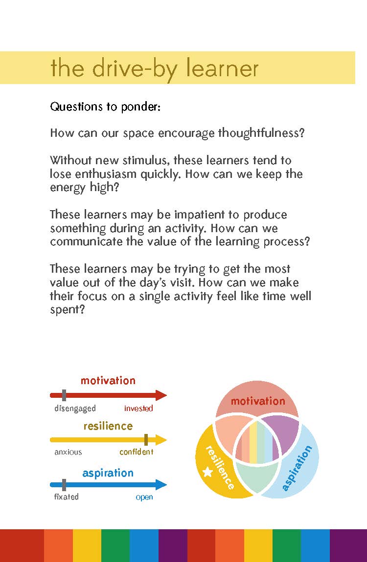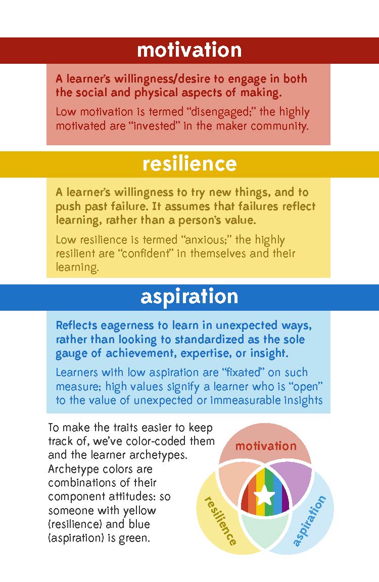 The Learner’s Behavior Model serves as the basis for analyzing guests and where they stand in relation to the three qualities (motivation, resilience, aspiration) needed to function at the fullest capacity inside the MAKESHOP.