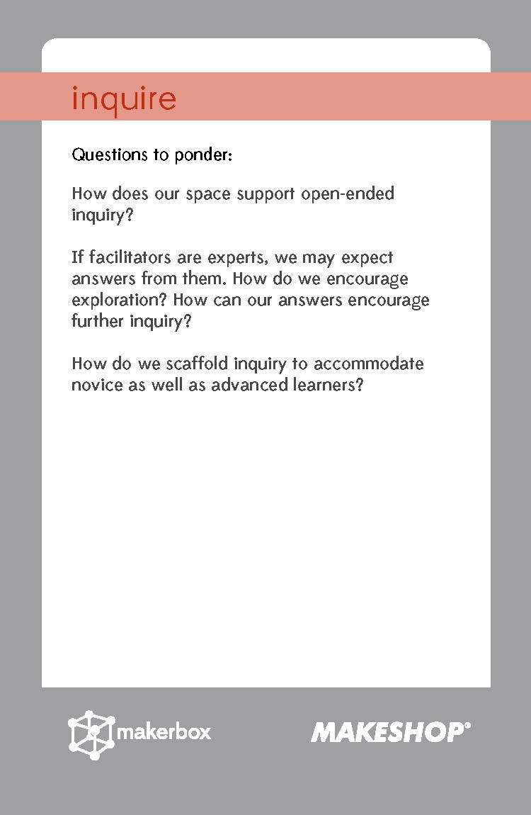 These Principles of Practice are behaviors displayed by learners in the makerspace that show when “learning” is taking place and by that nature, that the activity/space layout/facilitation strategy is working.