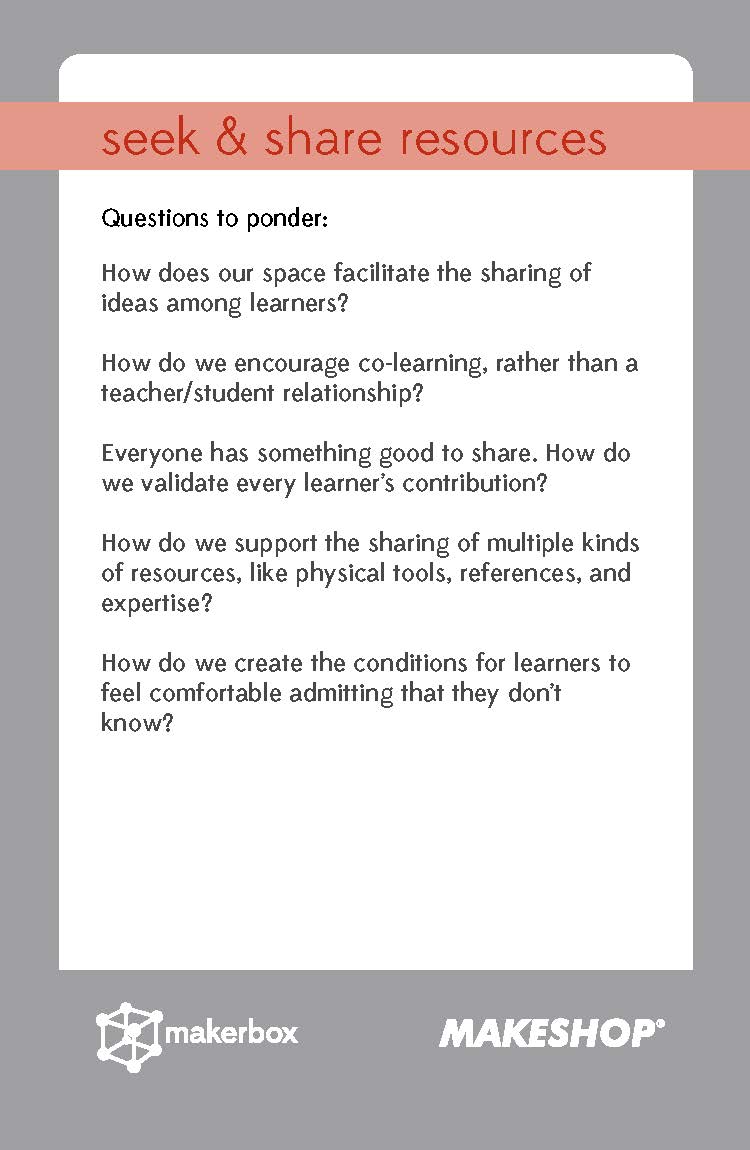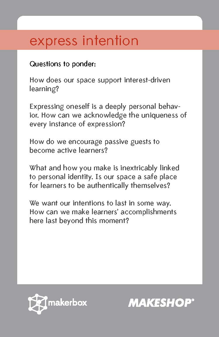 You cannot design for a guest without knowing the goals of the space. To aid in using our eight archetypes and Learner Archetype Model, Aristeia has taken the MAKESHOP’s seven Principles of Practice and have displayed them in a similar format to our archetype cards.