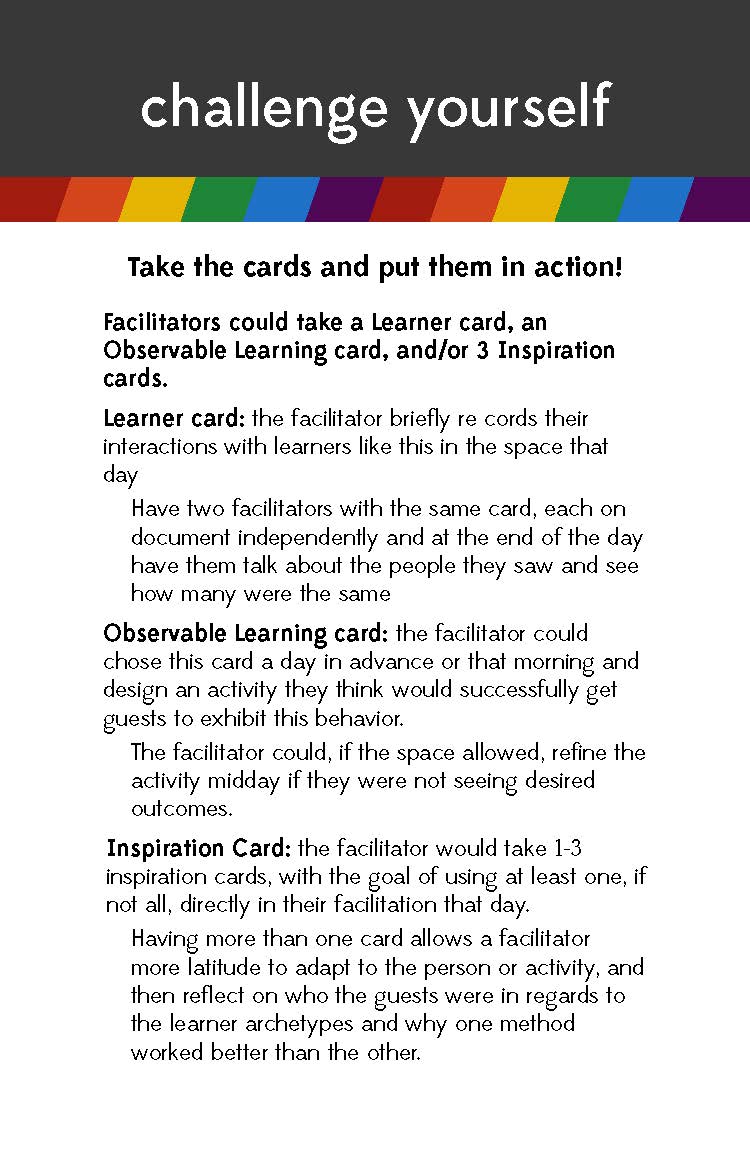 To break it down even further and give more information, Aristeia has created a deck of cards that can be used by makerspace staff as a design tool. This deck was designed to aid in the conception of activities, setting up the space, and forming facilitation strategies all to encourage family unit making.