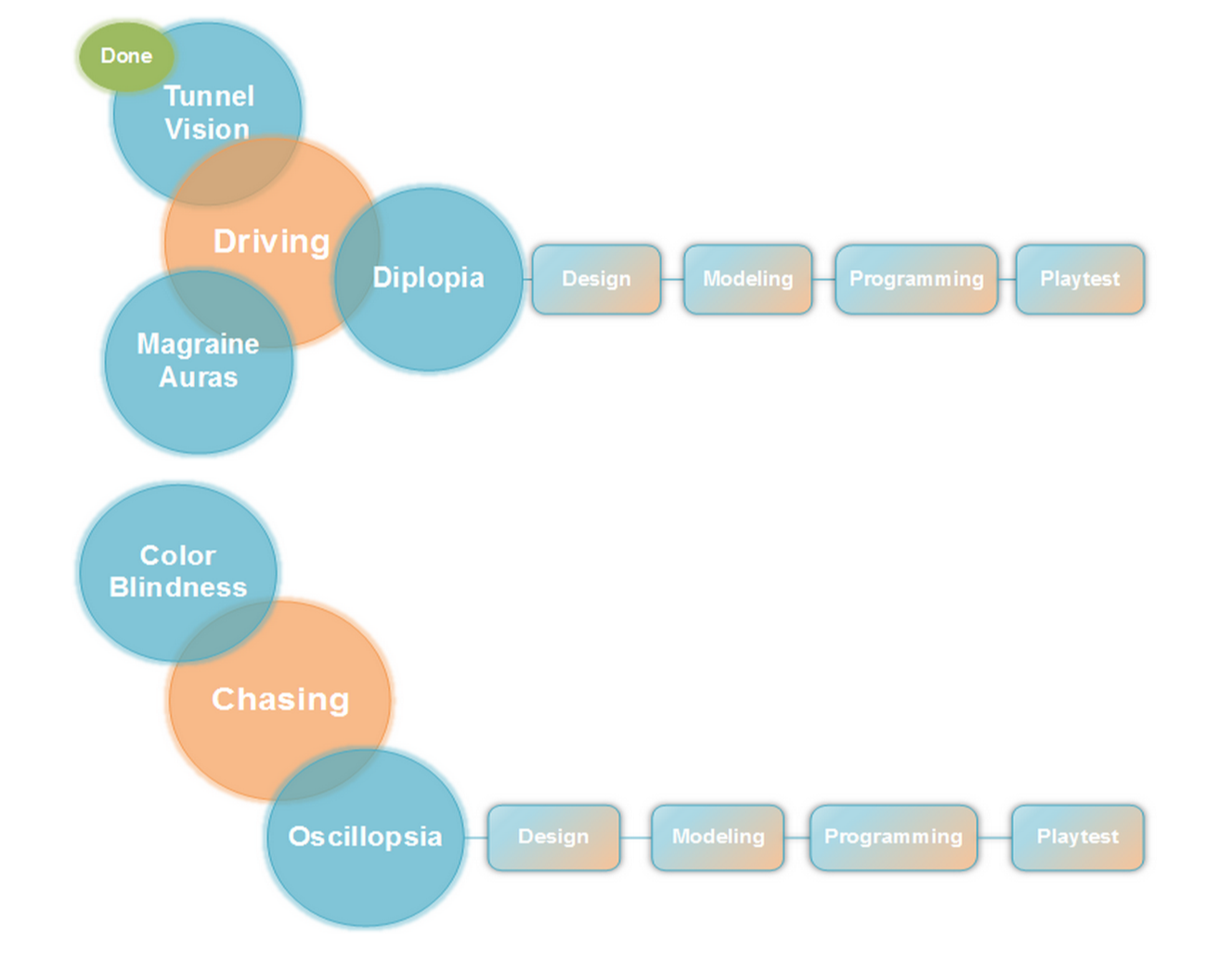 After halves we have decided to implement three symptoms with driving and two symptoms with chasing. Since we were done with one symptom for driving, we still need to develop two more driving prototypes and chasing prototypes. This week we successfully carried out a new prototype for driving activity and a new prototype for chasing activity as we planned. We started from map design, and then let the artist build the models. At the same time programmer would come up with a rough prototype which has all the basic gameplay implemented. Finally we integrated everything and conducted a playtest during the weekend.
