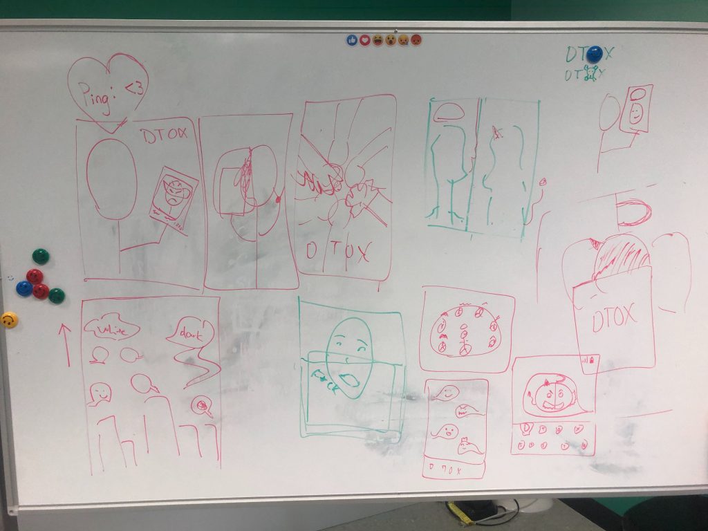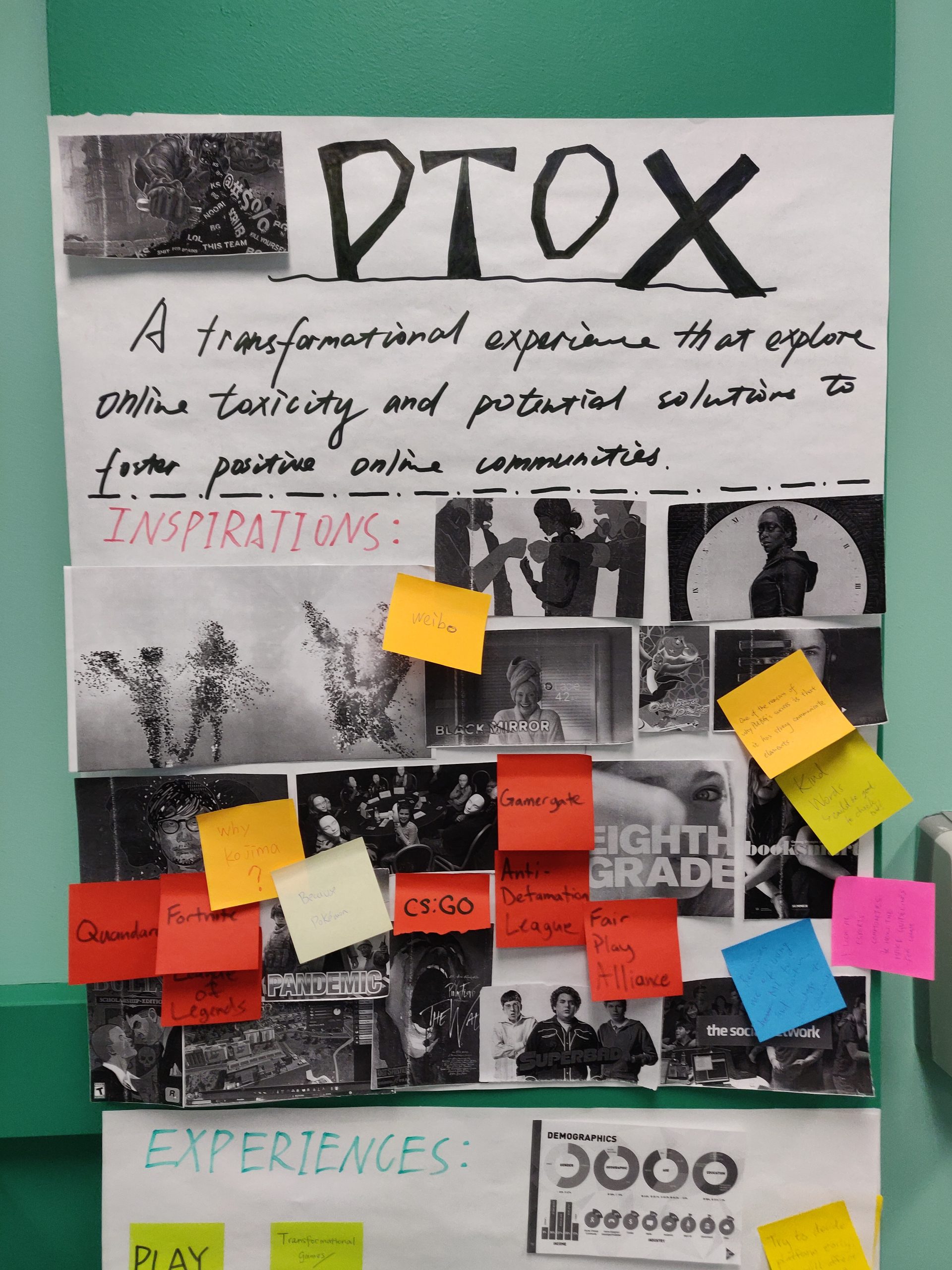 Midway through the week, we spent some time consolidating our information in a composition box. We took it to the Playtest to Explore workshop to get some communal feedback and ideas, which helped us understand our direction and identity as a team. We made a decision to focus primarily on toxicity in the gaming space, rather than online toxicity at large. While this is still a huge area, it does narrow our view considerably. Not to mention the composition box just being a nice thing to look at on the wall.