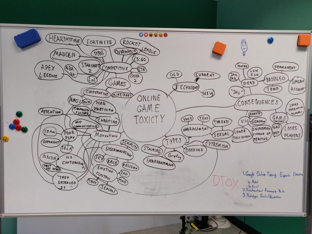 We also made a mind map to collect information and pen down our understanding about online gaming toxicity concepts. This contained just about everything idea we could think to write about gaming toxicity, in a general sense. It helped us get on the same page about the topic and stretch our minds a bit to see what we could come up with.