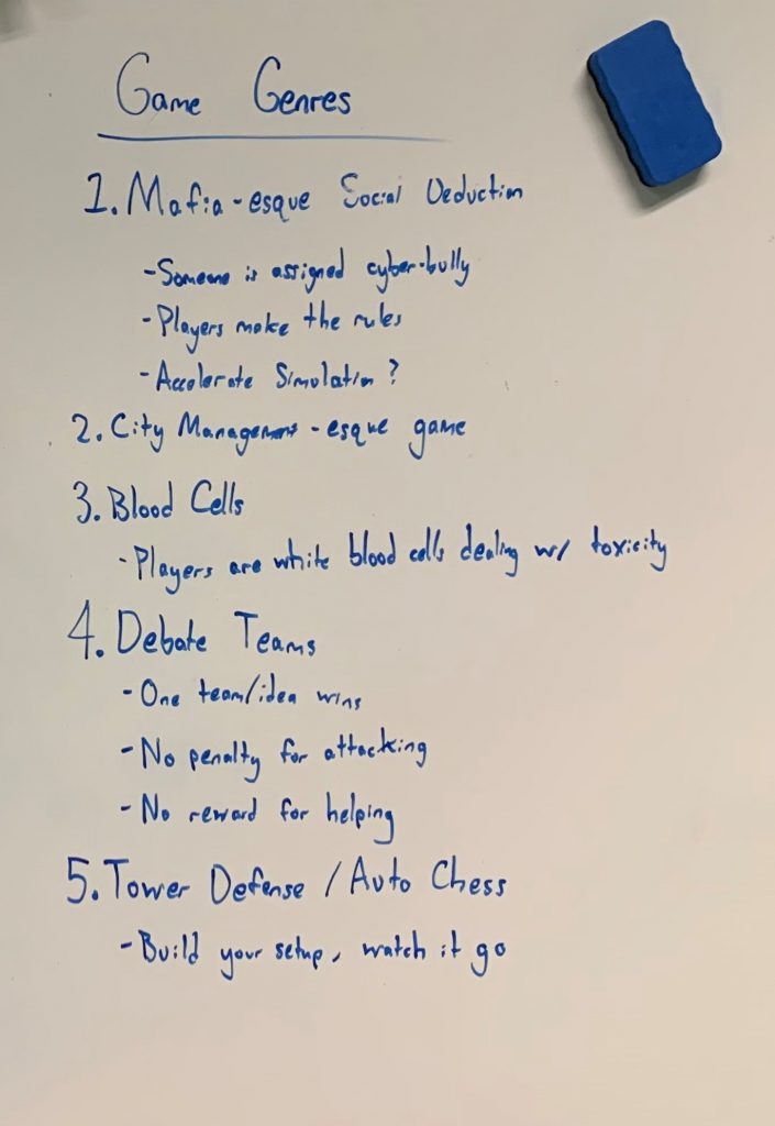 While talking about online toxicity and a bunch of different inspirational experiences, it was hard not to imagine what our game could be. We came up with a few different ideas here and there throughout the week, some focusing on different themes or metaphors, while others played around with mechanics to get a message across. We haven’t locked anything in for prototyping yet, but we thought it best to write down the ideas as they came.