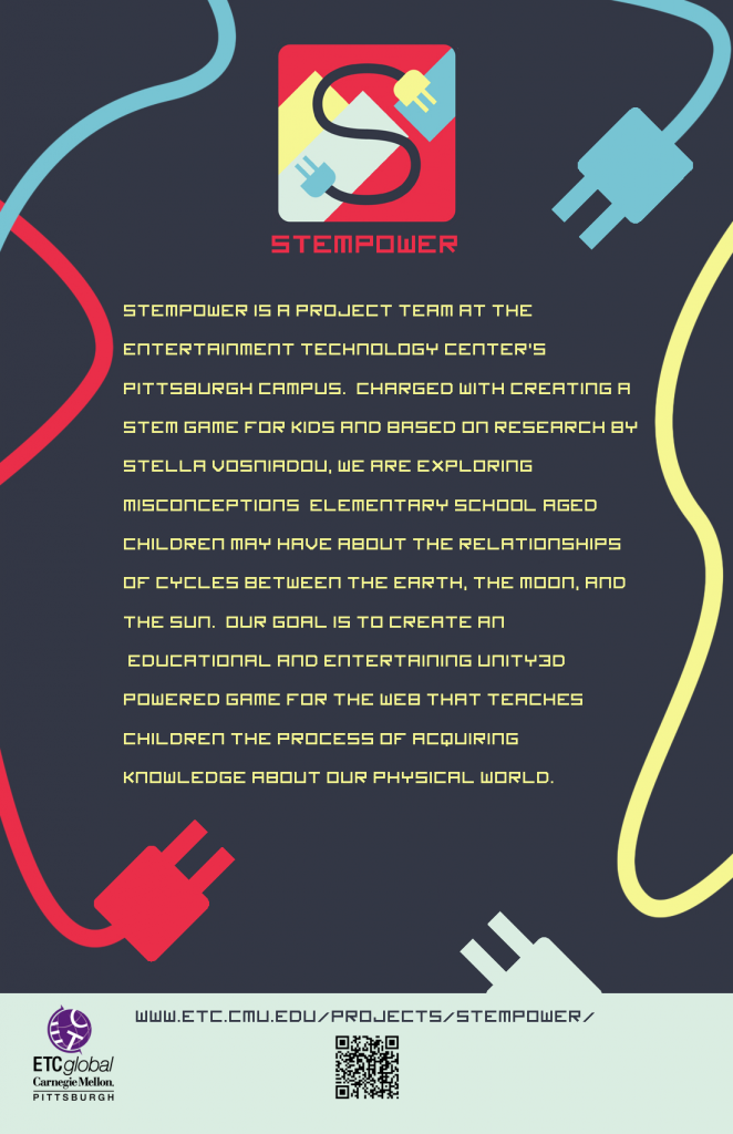 Stempower is a project team at the Entertainment Technology Center’s Pittsburgh campus. Charged with creating a STEM game for kids and based on research by Stella Vosniadou, we are exploring misconceptions elementary school aged children may have about the relationships of cycles between the earth, the moon, and the sun. Our goal is to create an educational and entertaining Unity3D powered game for the web that teaches children the process of acquiring